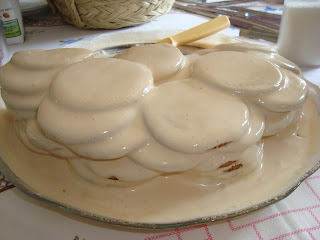 Batem-se muito bem as natas com o leite condensado cozido. Diluem-se as folhas de gelatina em água e leva-se ao micro-ondas um bocadinho para se desfazerem. Junta-se ao preparado das natas e do leite condensado, molham-se as bolachas no café e colocam-se em camadas com o preparado. Eu fiz numa forma de cheesecake porque já me tinha corrido mal a brincadeira e o doce "desmoronou-se" todinho... Pus no congelador enquanto almoçávamos e servi bem geladinho. Hum... já "marchava" um bocadinho.
